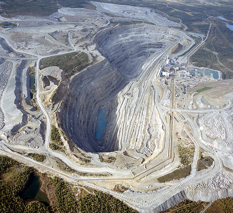 Bild från dagbrottet i Aitik, ytan är ca. 1 x 3 km, i jämförelse med de fyra planerade gruvorna Nunasvaara Södra, Nunasvaara Norra, Niska Södra och Niska Norra som kommer att kräva ungefär den dubbla ytan, ca. 1 x 6 km.